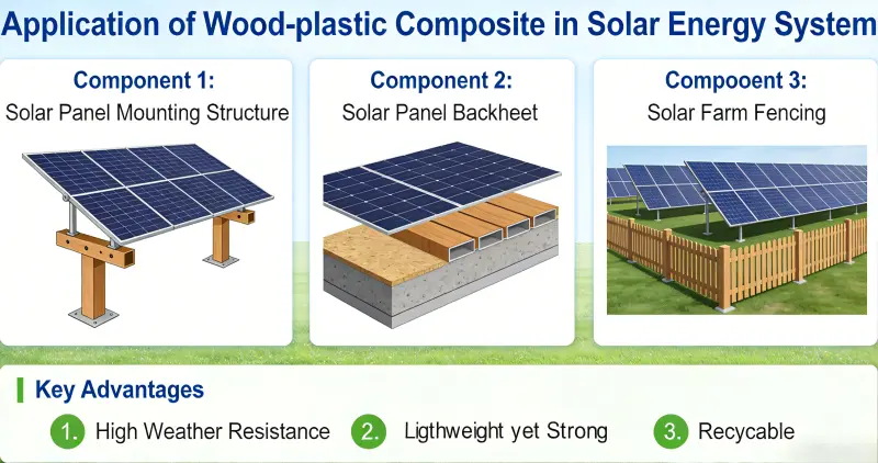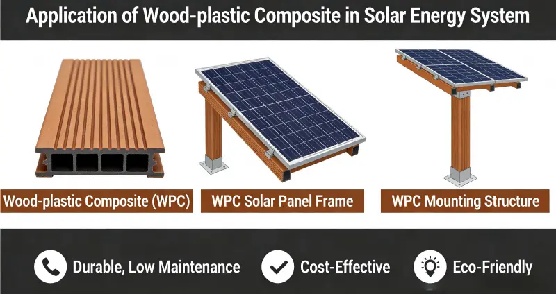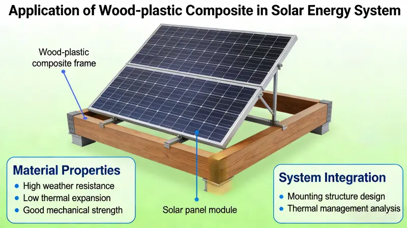 Træ-plastkomposit (WPC) er dukket op som et nøglemateriale i solenergisystemer, herunder fotovoltaiske (PV) monteringer, flydende kraftværker, PV-bygningsintegration og koncentreret solenergi (CSP) lagring, på grund af dets miljøvenlige, vejrbestandige, lette, lav-vedligeholdelsesmæssige og nemme at behandle egenskaber. Det erstatter gradvist traditionelle metal- og træmaterialer.